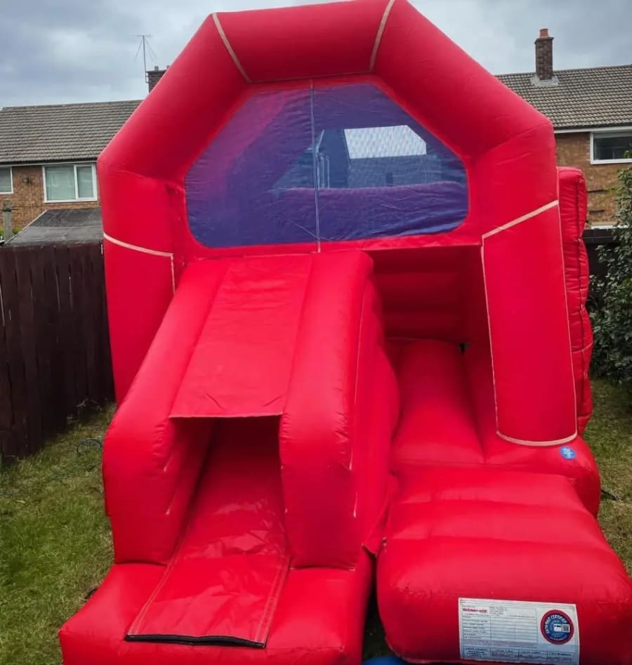 Red - Pick a Theme Slide castle combo This unit is 11ft x 16ft x 9.6ft height. Required space 14ft x 19ft x 10ft height This unit is suitable for child use only with outdoor and indoor hire, it has an overall height of 9ft 6" so please be mindful of this hire plain or with a theme.