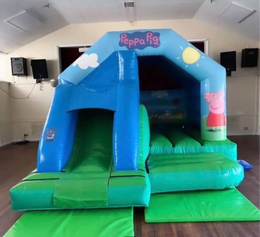 This vibrant and eye-catching bouncy castle for hire in Middlesbrough and across Teesside features a fun Peppa Pig theme, with bright green and orange colors that are sure to capture the attention of children and adults alike.
