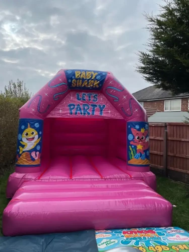 12ft wide x 14ft long x 10.6ft highPink baby shark themed bouncy castlePlease check the measurements before booking £10 non refundable booking fee