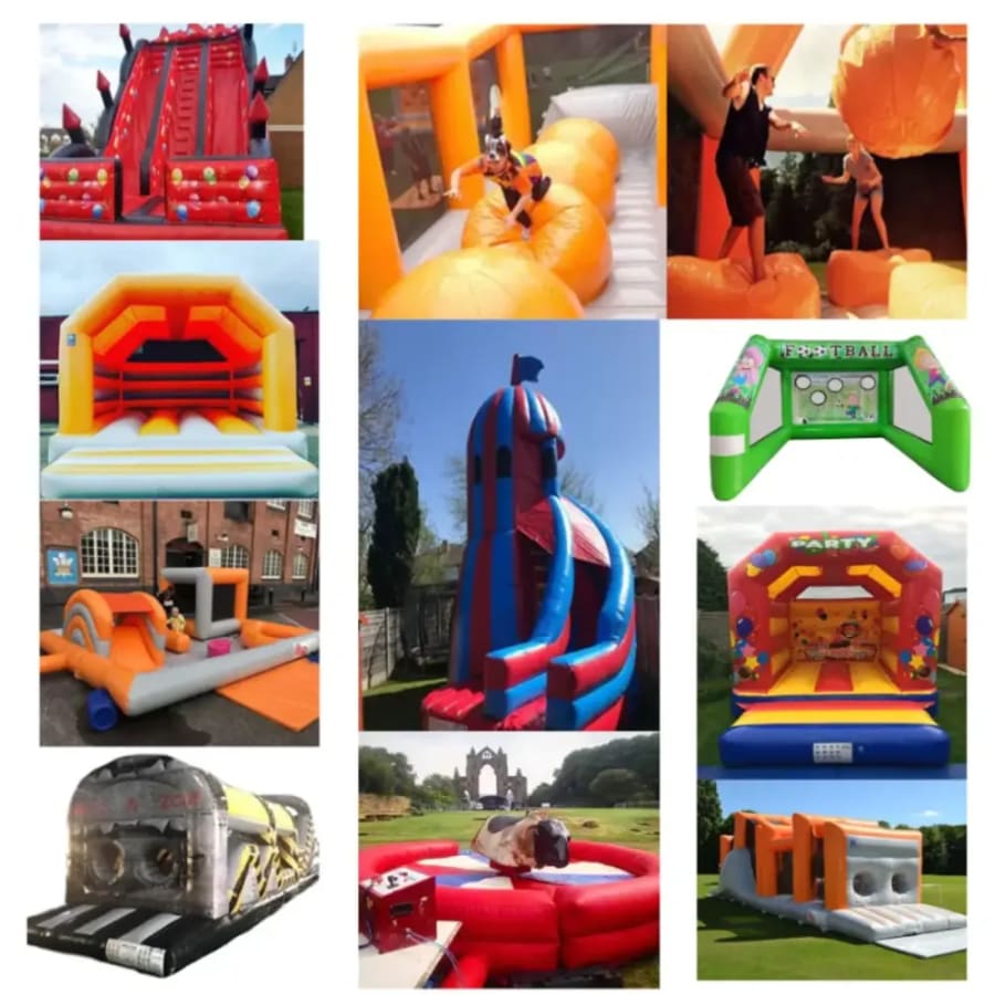 Includes mega slide, helter skelter, adult castle, big orange balls, toddlers play park, standard bouncy castle, wrecking ball, penalty shoot out, 2 part assault course, rodeo bull and battlezone assault course