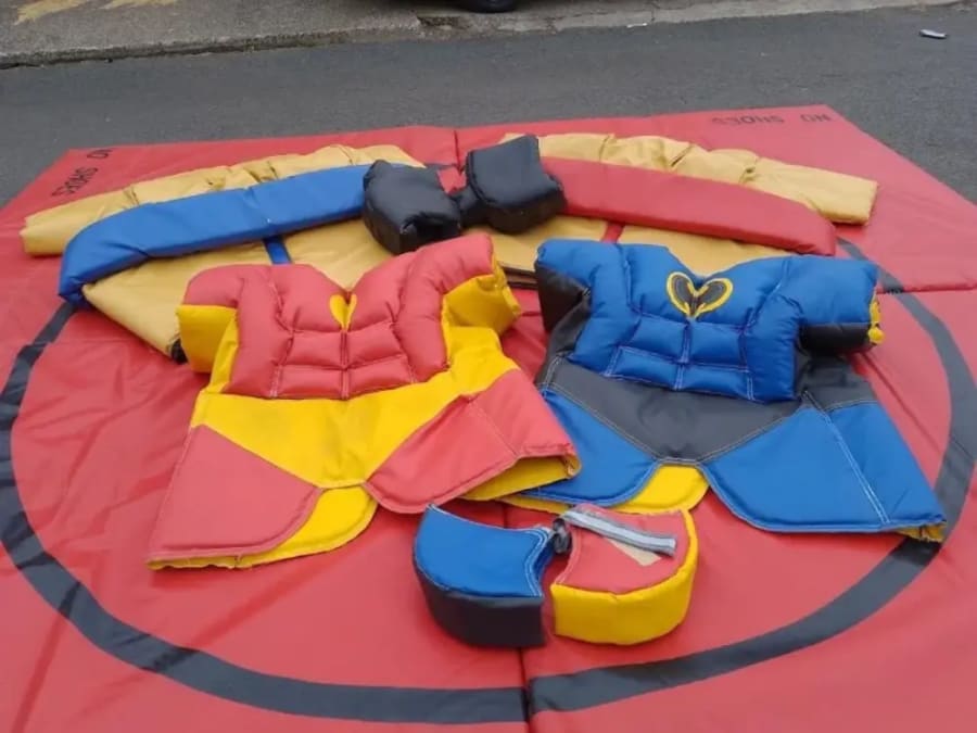 Our family set of sumo suits includes 2 children's suits, 2 adults suits, 4 neck braces and 4 sumo wrestler style safety helmets and one crash mat. These are great fun for family get-togethers, family orientated events and fun days! This is a great competitive garden game and will ensure to bring some thrills to your party.