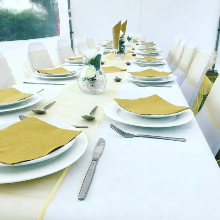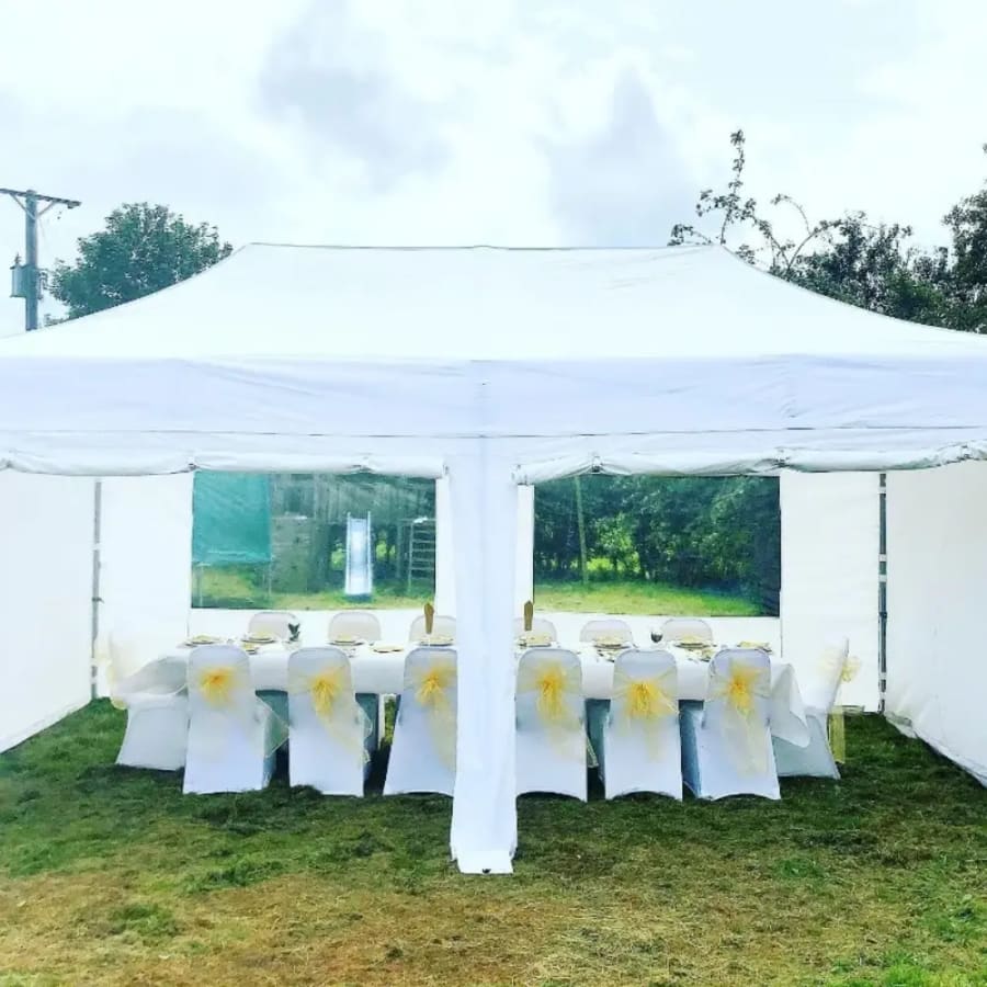 This package includes our 3x6m heavy duty and waterproof commercial gazebo, table & chairs fully dressed with white chair covers, your choice of coloured sash, table clothes, centre pieces, plates & cutlery.