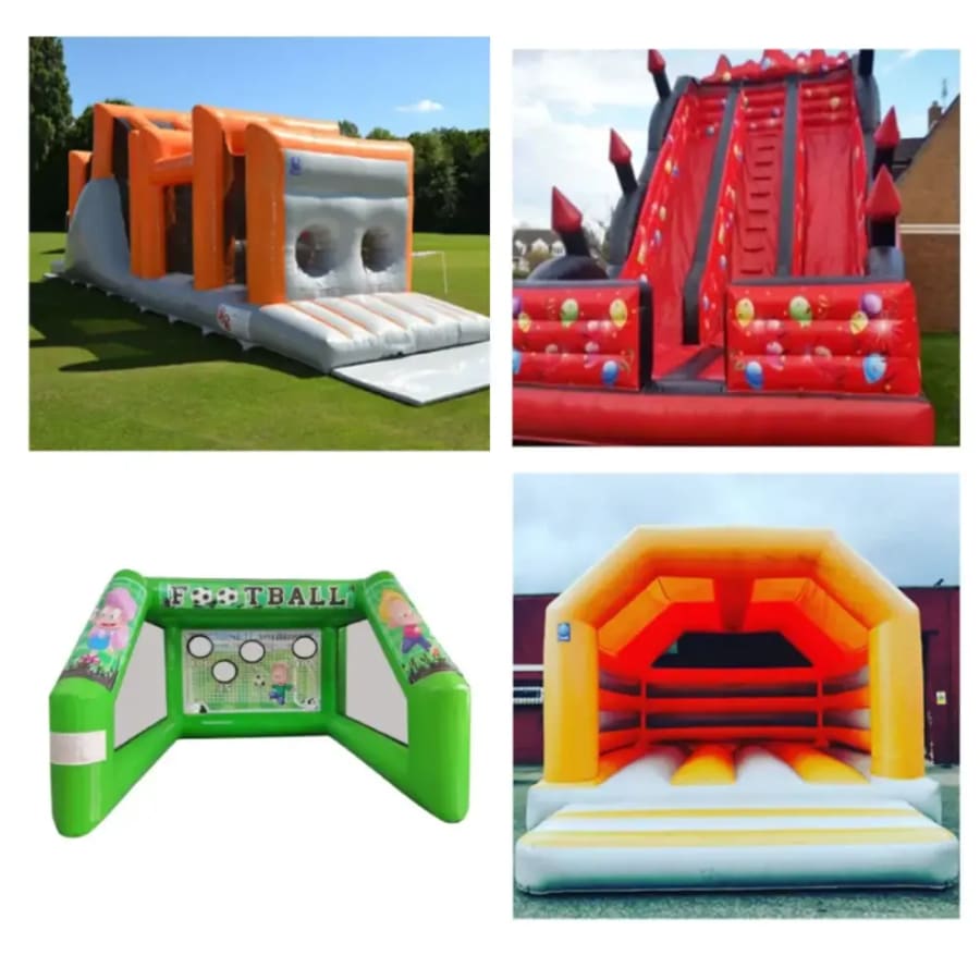 Includes 2 part assault course, mega slide, adult castle and penalty shoot out