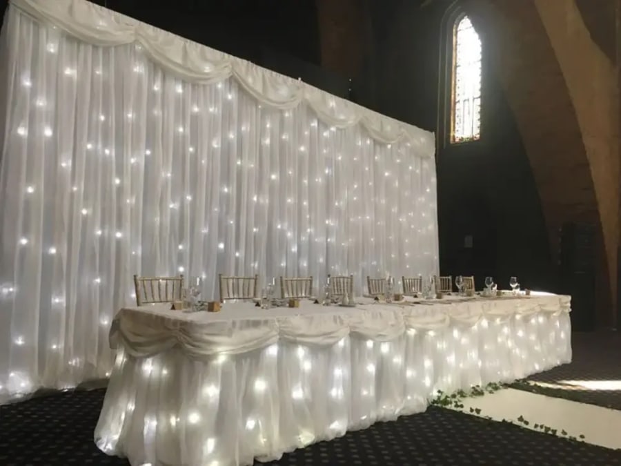 Starlight backdrops can totally transform your wedding venue by hiding unsightly walls and changing the appearance of your top table. It can also create the perfect backdrop feature for photographs.